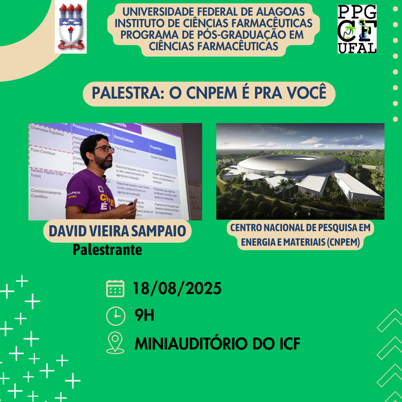 Resumo da apresentação: O Centro Nacional de Pesquisa em Energia e Materiais (CNPEM) é uma organização social supervisionada pelo Ministério da Ciência, Tecnologia e Inovação (MCTI). Localizado em Campinas-SP, o CNPEM abriga laboratórios nacionais de relevância mundial, sendo uma referência internacional em pesquisa científica avançada. O CNPEM oferece instalações abertas de última geração, como o acelerador Sírius, que está entre as fontes de luz síncrotron mais avançadas do mundo, o LNNano (Laboratório Nacional de Nanotecnologia), o LNBio (Laboratório Nacional de Biociências) e o LNBR (Laboratório Nacional de Biorrenováveis). Contudo, essas instalações ainda são pouco exploradas por pesquisadores de algumas regiões do país, especialmente no Norte e Nordeste. Neste seminário, o prof. David, do Instituto de Física e embaixador do CNPEM na UFAL, apresentará as principais instalações do CNPEM e as suas formas de acesso, incluindo o programa de auxílios. Será dada especial ênfase às instalações com maior potencial de impacto nas pesquisas em Ciências Biológicas e da Saúde.